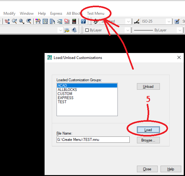 ตัวอย่างต่อไปสร้างไฟล์เมนูใหม่ชื่อ TEST5.mnu โดยนำเมนู Test4 มาเพิ่ม การเรียกใช้งาน AutoLISP เข้าไป ดังนี้